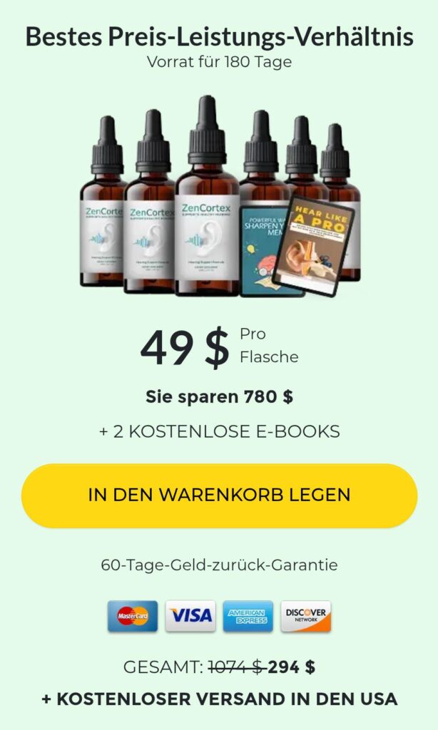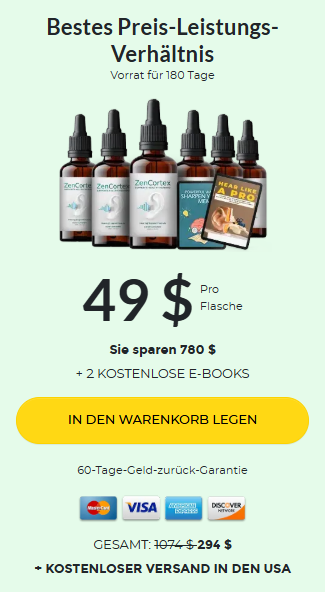 Für beste Ergebnisse wird empfohlen, ZenCortex™ über einen Zeitraum von mindestens 3 bis 6 Monaten einzunehmen. Dies gibt den Inhaltsstoffen genügend Zeit, Ihre auditive Gesundheit und kognitive Funktion optimal zu unterstützen. Während man auch nur eine Flasche kaufen kann, entscheiden sich die meisten Kunden für die 3- oder 6-Flaschen-Pakete, da diese das beste Preis-Leistungs-Verhältnis bieten. Bitte beachten Sie, dass diese Rabatte nicht das ganze Jahr über verfügbar sind.